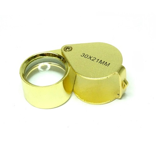 Лупа с увеличением 30 крат, диаметр просмотрового поля 21 мм. Такая лупа подойдет для рассмотрения драгоценных камней, ювелирных украшений, растений, а также будет удобна путешественникам и туристам из-за маленьких габаритов и небольшого веса. Линза изготовлена из высококачественного стекла, а обод и корпус из сплава металлов. В сложенном состоянии лупа защищена от царапин и загрязнений. Элегантная ювелирная лупа золотого цвета, в пластиковой коробочке может стать оригинальным и недорогим подарком. При увеличении 30 крат расстояние от линзы до объекта составит ~0,5-2,5 см.