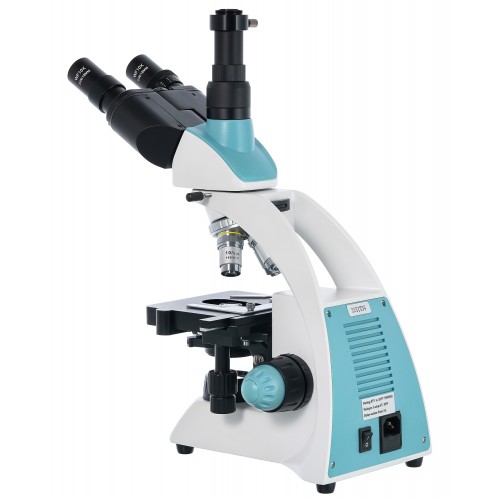 Микроскоп оснащен поворотным тринокулярным блоком, что обеспечивает комфортный обзор образцов с различных углов. Наклон в 30° позволяет легче настраивать рабочую позицию, минимизируя напряжение в шее и спине пользователя в процессе длительных исследований. Подобный дизайн делает этот прибор идеальным для групповых исследований и демонстраций.