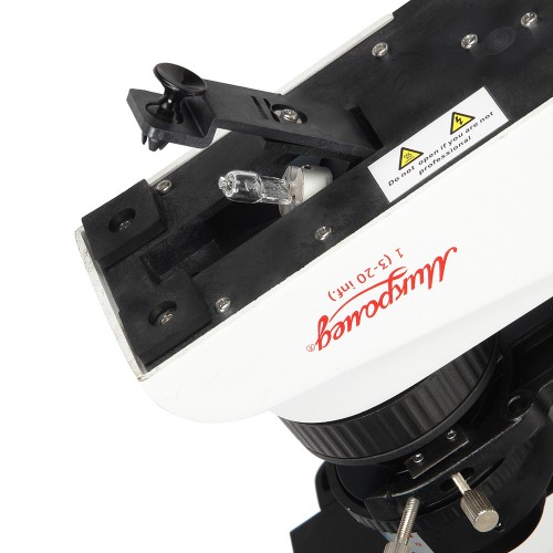 Освещение осуществляет галогенная лампочка, расположенная в нижней части прибора, с возможностью регулировки яркости. Эта функция позволяет точно настраивать освещение в зависимости от объектов исследования, что важно для достижения максимальной четкости изображения. Центрируемый конденсор Аббе также добавляет гибкости в управлении светом.