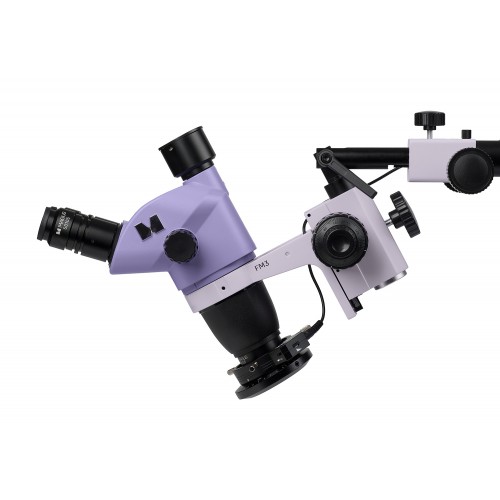 Штатив микроскопа имеет тяжелое основание, что обеспечивает устойчивость и минимизирует вибрацию во время работы. Длинная горизонтальная штанга и возможность регулировки угла наклона оптической оси позволяют оператору легко подстраивать рабочее положение, улучшая комфорт и точность выполнения задач.