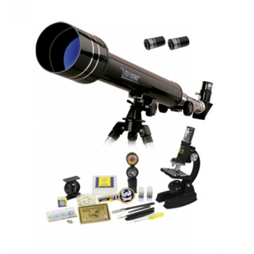 - Комплект включает телескоп и микроскоп с рядом аксессуаров.
