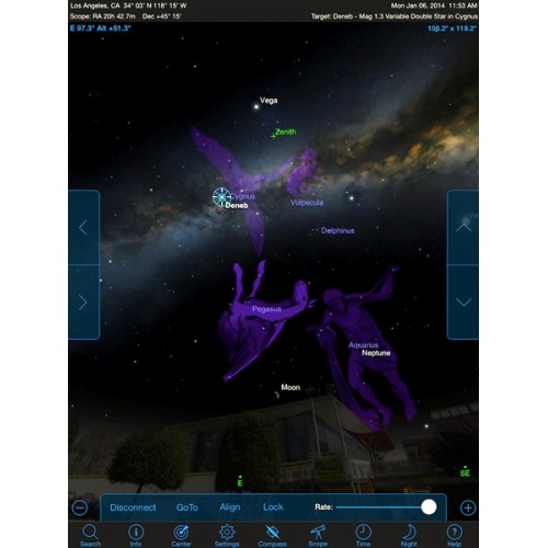 Приложение Celestron® SkyPortal™ предлагает доступ к базе данных из 40 000 астрономических объектов. Это означает, что вам не нужно запоминать координаты – достаточно выбрать интересующий вас объект и использовать функцию GoTo для его локализации. Возможность планирования наблюдений на 100 лет вперед также является значительным преимуществом.
