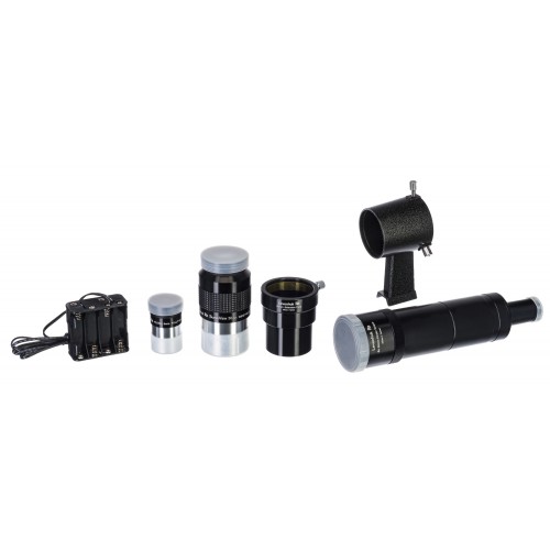 В набор входят всё необходимое для начала наблюдений: оптический искатель 8x50 и два окуляра с различными фокусными расстояниями. Эти дополнительные элементы значительно упрощают настройку и использование телескопа, позволяя легко перебирать различные параметры наблюдений и погружаться в изучение космоса.