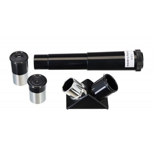 Телескоп поставляется с полным комплектом необходимых аксессуаров, что делает его готовым к использованию сразу после покупки. В комплект входят два окуляра, оборачивающий окуляр и диагональное зеркало, что позволяет сразу начать наблюдения без дополнительных затрат.