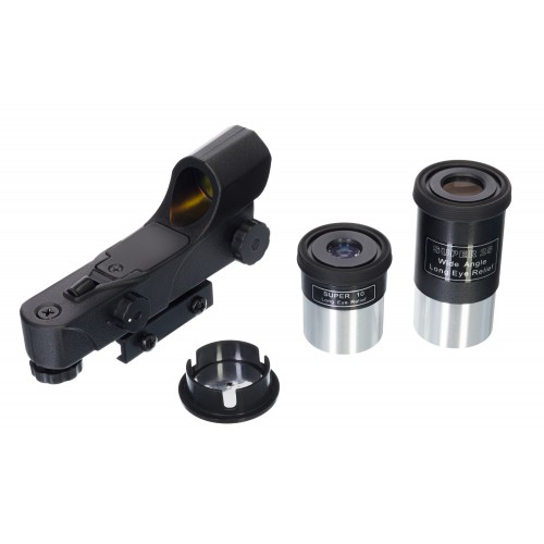 Телескоп комплектуется двумя окулярами и искателем с красной точкой, что помогает быстро и точно настраивать фокус. Это делает его ещё более привлекательным выбором для тех, кто только начинает свой путь в астрономии и хочет иметь все необходимое для полного погружения без дополнительных расходов.