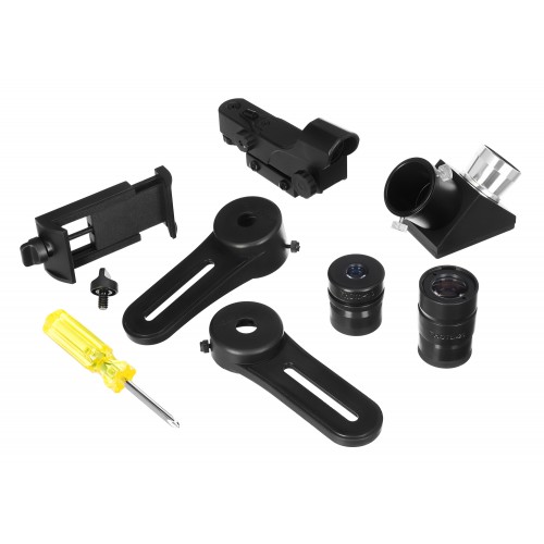 В комплекте с телескопом идут необходимые аксессуары: два окуляра различного увеличения, диагональное зеркало и искатель с красной точкой. Это обеспечивает удобство в использовании, позволяя вам сразу начать заниматься наблюдением. Дополнительные принадлежности, такие как противовес и штатив, добавляют стабильности и увеличивают комфорт во время сессий.