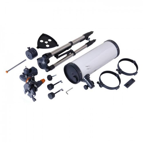 Телескоп не только функционален, но и стильно оформлен. Его белая глянцевая труба в сочетании с черными крышками и оранжевыми деталями монтировки создают привлекательный внешний вид. Удобный искатель с увеличением 6х облегчает процесс нацеливания на объекты, а прочный штатив из нержавеющей стали обеспечивает надежную устойчивость и долговечность конструкции.