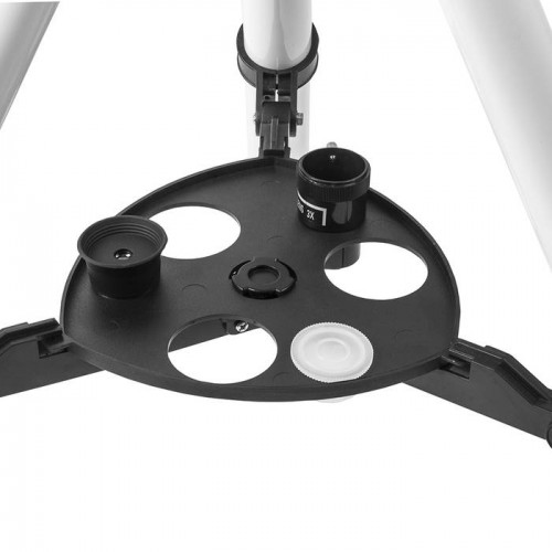 Телескоп установлен на устойчивом штативе с возможностью регулировки высоты, что позволяет использовать его в различных условиях. Распорки для ножек не только увеличивают стабильность, но и служат основанием для аксессуаров. Это делает использование телескопа более комфортным и организованным, что немаловажно при выездах на природу.