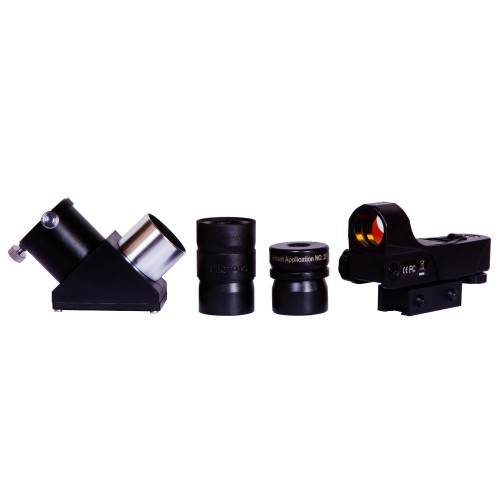В комплекте предусмотрены два окуляра, которые дают различные увеличения, а также диагональное зеркало для наземных наблюдений. Эти аксессуары делают телескоп универсальным инструментом для изучения как астрономических объектов, так и элементов ландшафта, что расширяет его функциональные возможности.