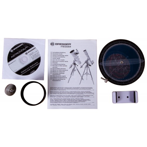 В комплект устройства входят все необходимые элементы, такие как окуляр SUPER Plössl, оптический искатель и множество переходников, что делает его готовым к использованию сразу после покупки. Пользователи будут рады найти полезные дополнения, такие как планисфера и диск с планетарием Stellarium, что дополнительно облегчает процесс знакомства с астрономией.